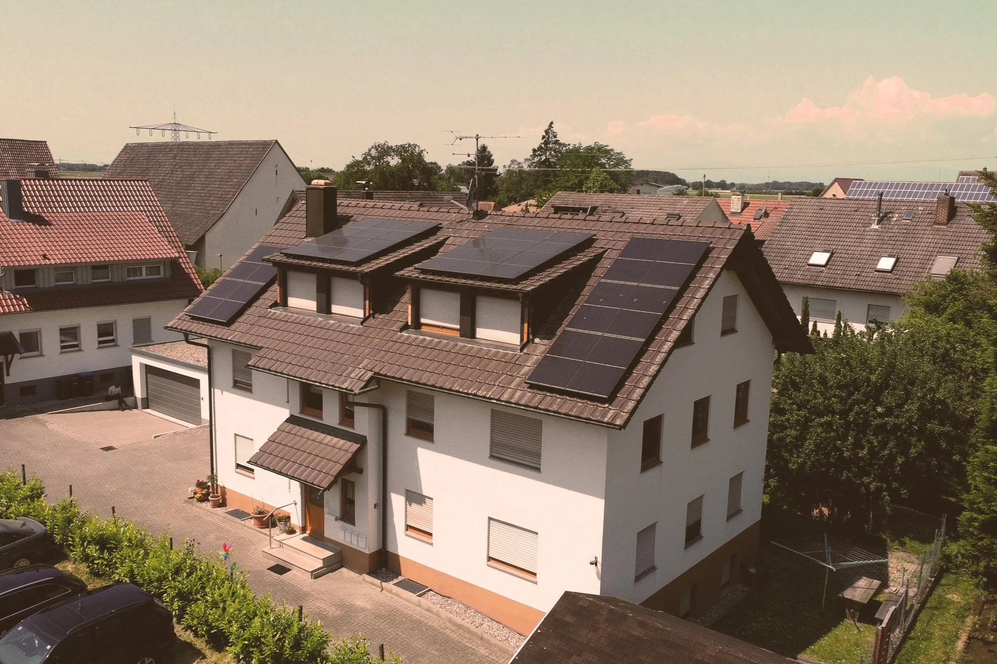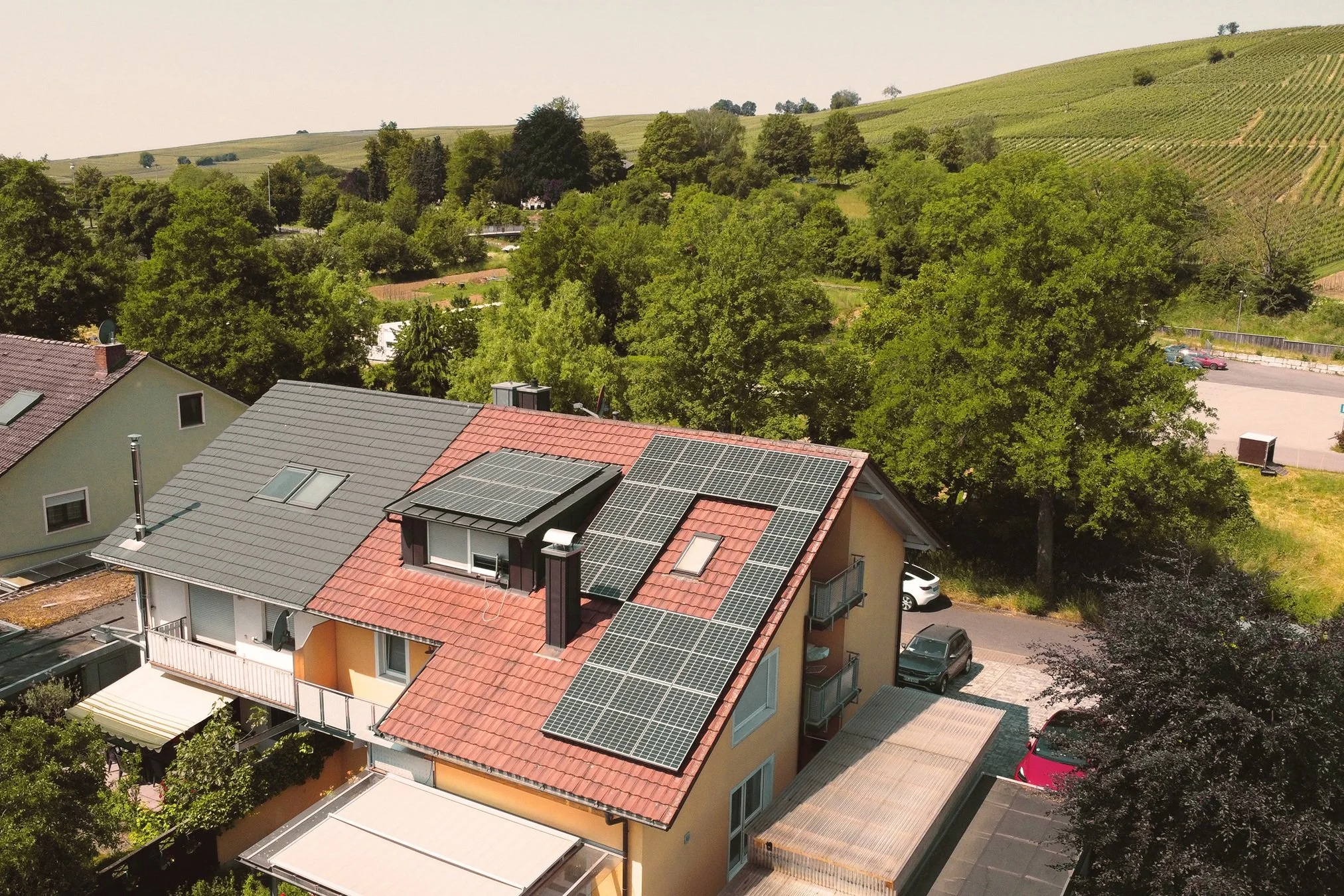 Bei dieser Anlage auf einem Mehrfamilienhaus in Ihringen kamen verschiedene Montagesysteme zum Einsatz, da die Dachflächen unterschiedlich eingedeckt sind. Die Photovoltaikanlage wurde als SolarEdge-System mit Heckert Solar Modulen realisiert und fasst Süd-,Ost- und Westausrichtung zusammen.