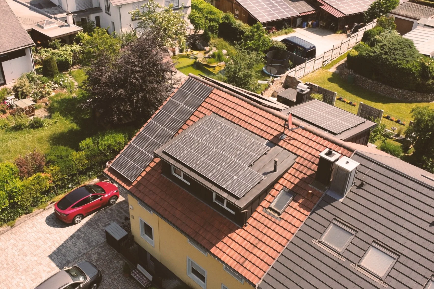 Diese Anlage setzt auf Heckert Solar Module der Serie NeMo 3.0. Es wurden Dachflächen und Gauben mittels SolarEdge zu einer leistungsfähigen Anlage kombiniert. Ein BYD-Speicher sowie eine Heizstab-Steuerung runden das System ab.